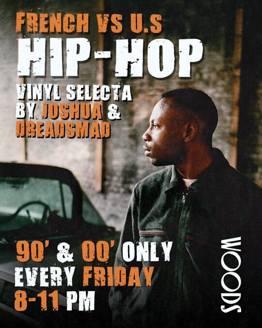 Your favourite Friday ritual: enjoy the warmth of ’90s and ’00s hip-hop on vinyl, every Friday at Woods. Joshua takes to the decks with a curated selection of French and American tracks from hip-hop’s golden decades.